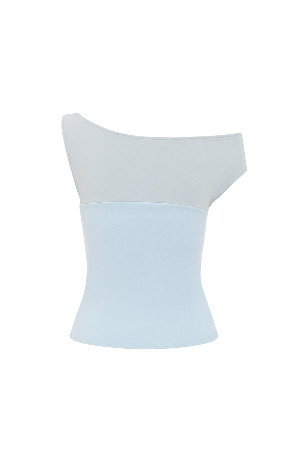 Sleeveless top with an asymmetrical Bardot neckline designed to be worn partially off the shoulder. Features an above bust seam, twin needle hemline, two tone colourway and can be worn in reverse. Made from a cotton-elastane blend for a breathable, flexible fit.