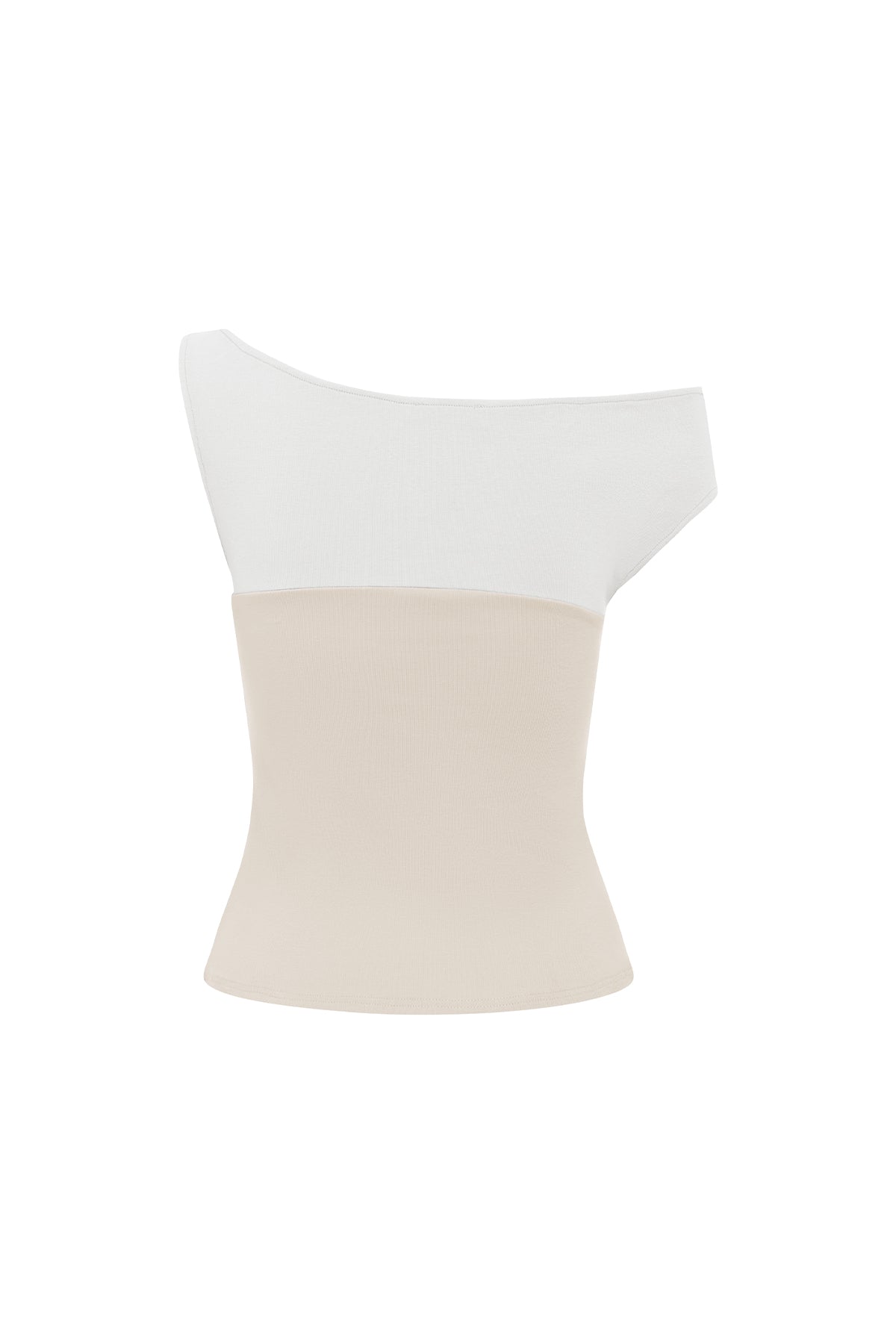 Sleeveless top with an asymmetrical Bardot neckline designed to be worn partially off the shoulder. Features an above bust seam, twin needle hemline, two tone colourway and can be worn in reverse. Made from a cotton-elastane blend for a breathable, flexible fit.