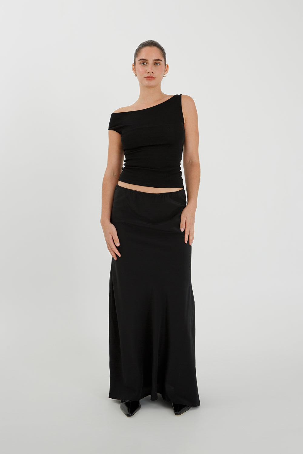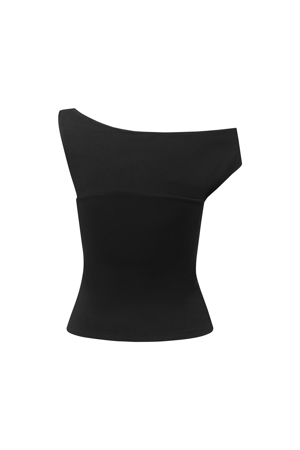 Sleeveless top with an asymmetrical Bardot neckline designed to be worn partially off the shoulder. Features an above bust seam, twin needle hemline and can be worn in reverse. Made from a cotton-elastane blend for a breathable, flexible fit.