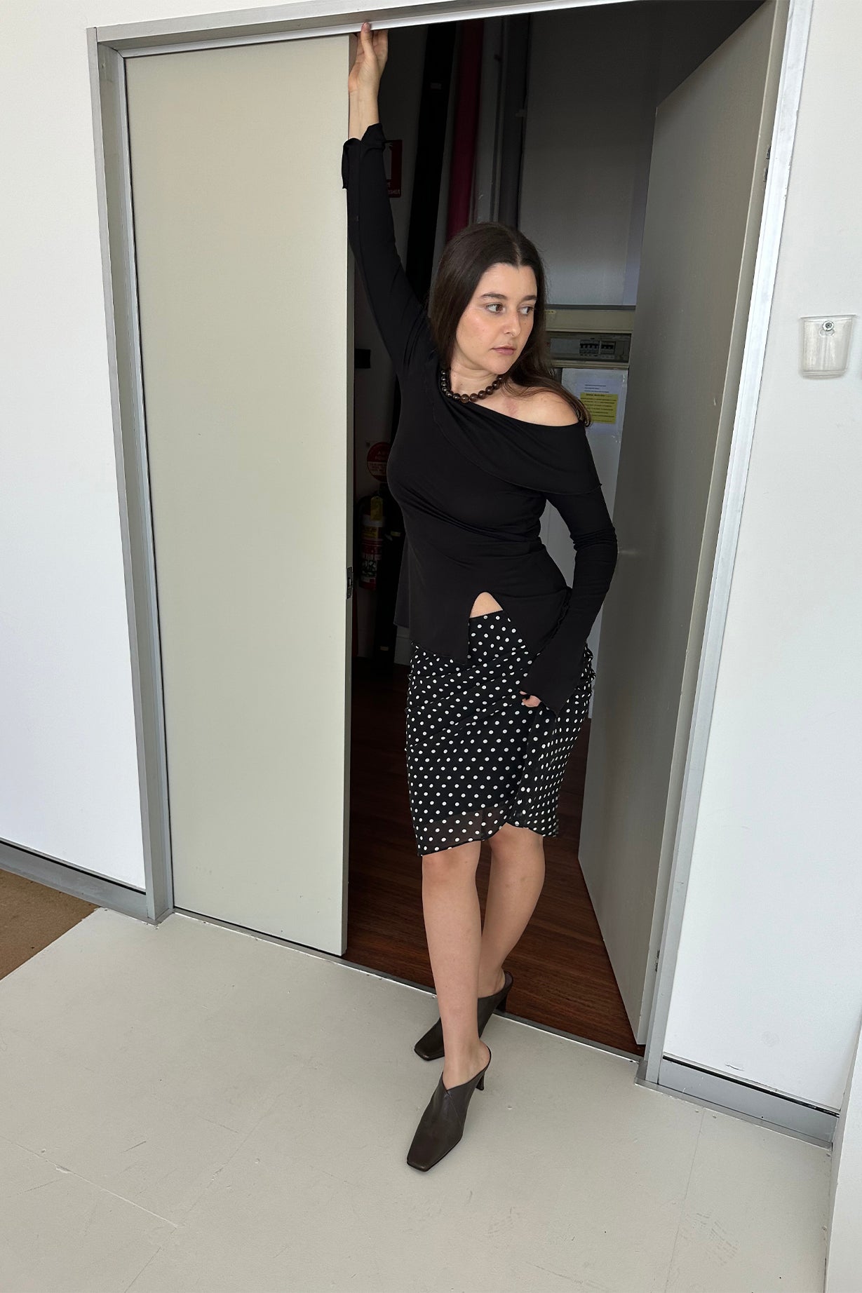 Long sleeve top with a Bardot neckline in soft jersey. Features a neckline band, babylock finish on all edges, and a sleeve hem split. Front hemline includes a subtle hip split for ease of movement. Made from a cotton-elastane blend for a smooth, flexible fit.