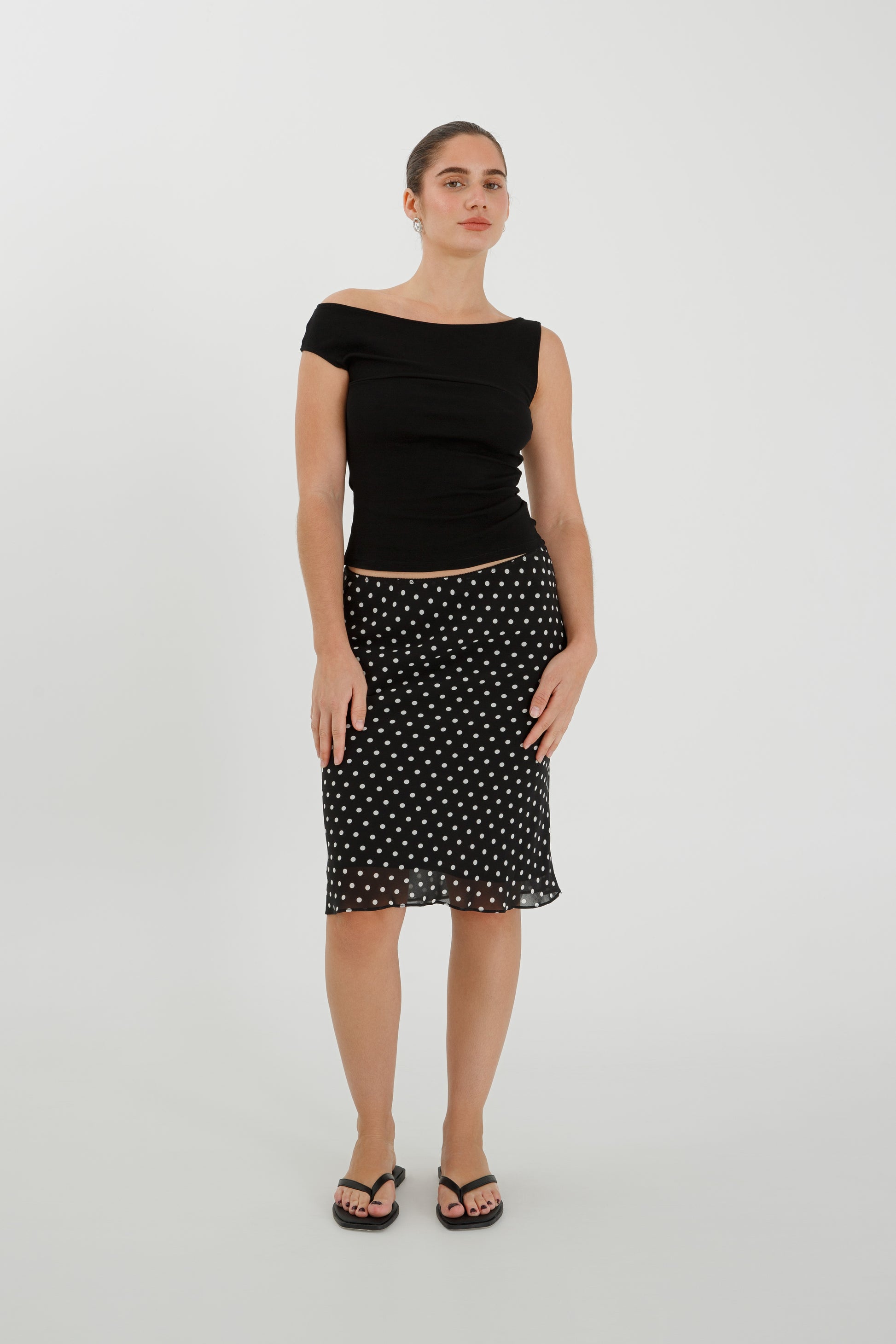 Bias-cut silk georgette skirt with a knee-length hemline and a scallop-edge elastic waistband for a comfortable, pull-on fit. Finished with a babylock hem for a soft, flowing drape. Digital print on semi-sheer silk georgette, fully lined in Tencel for a smooth feel against the skin.