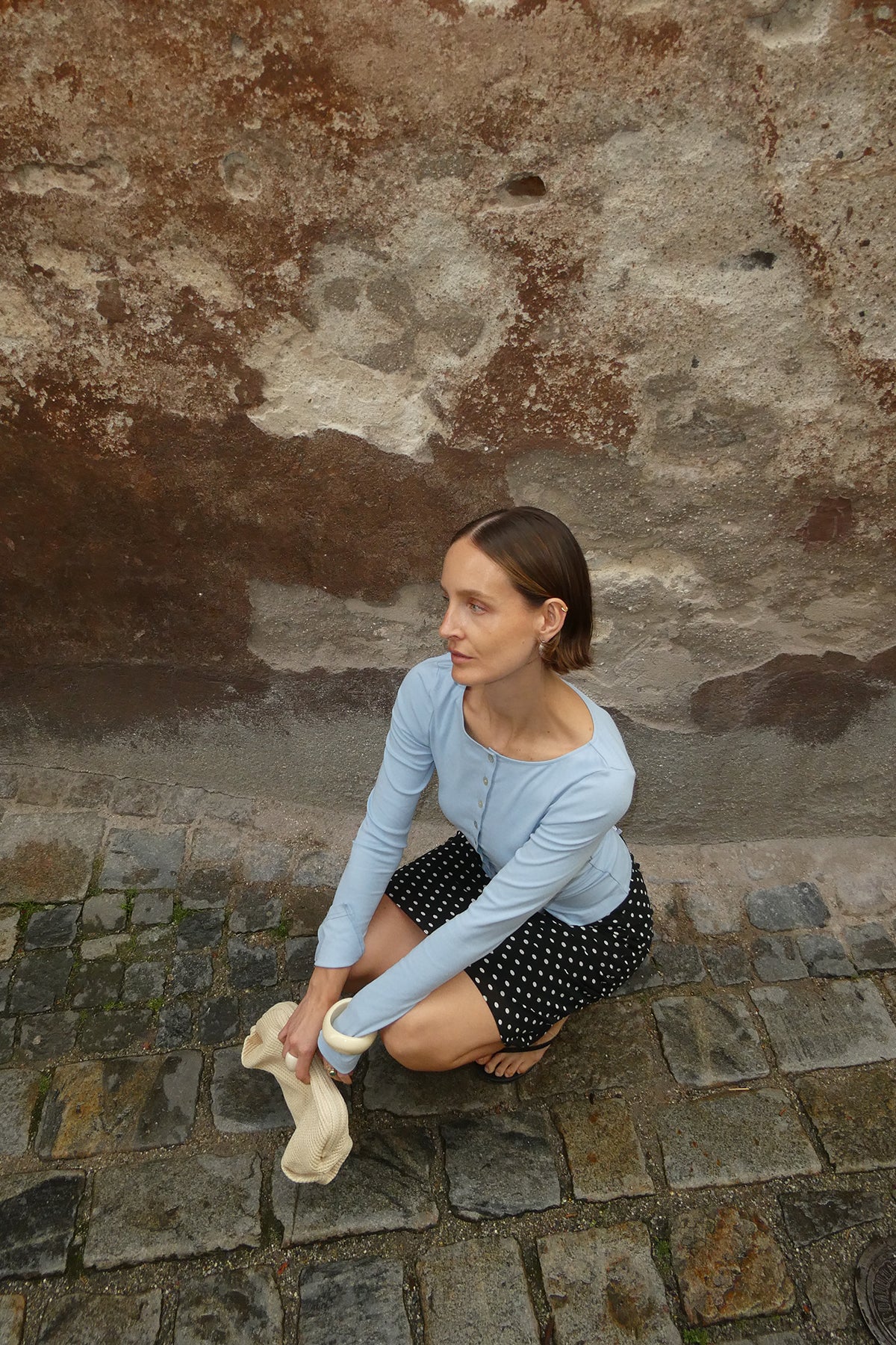 Bias-cut skirt in 100% mulberry silk crepe de chine with a knee-length hemline. Designed with a scallop-edge elastic waistband for a comfortable, pull-on fit. Finished with a babylock hem for a soft, flowing drape. Unlined for a lightweight, natural feel.