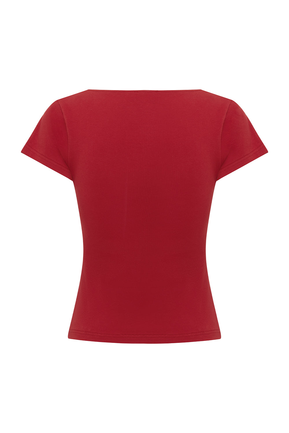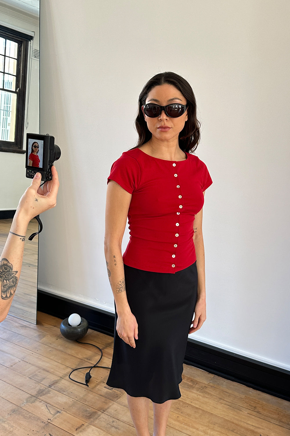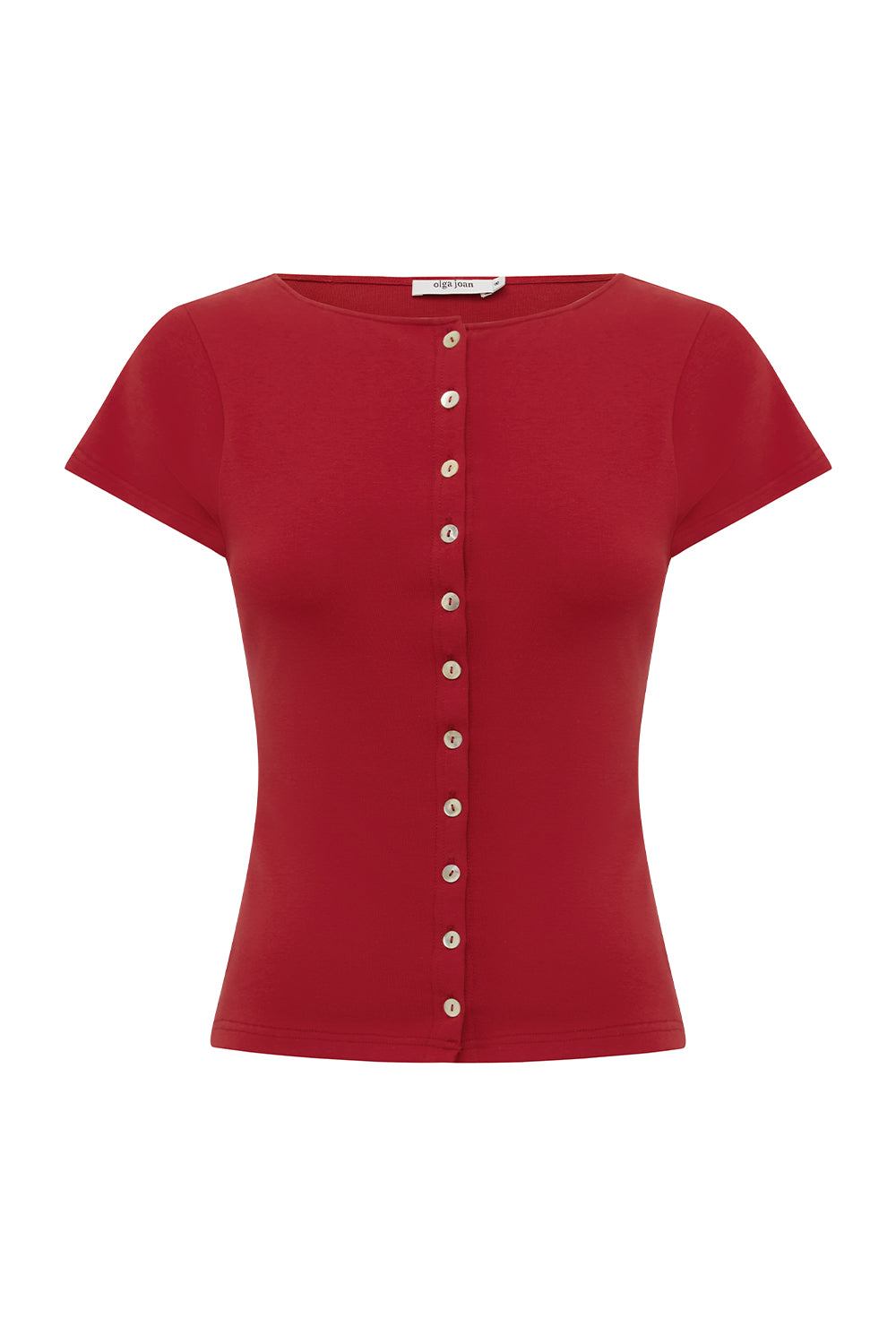 Button-through cap-sleeve top in soft jersey. Features a shallow bateau neckline and shell button front closure. Made from a cotton-elastane blend for a breathable, flexible fit.