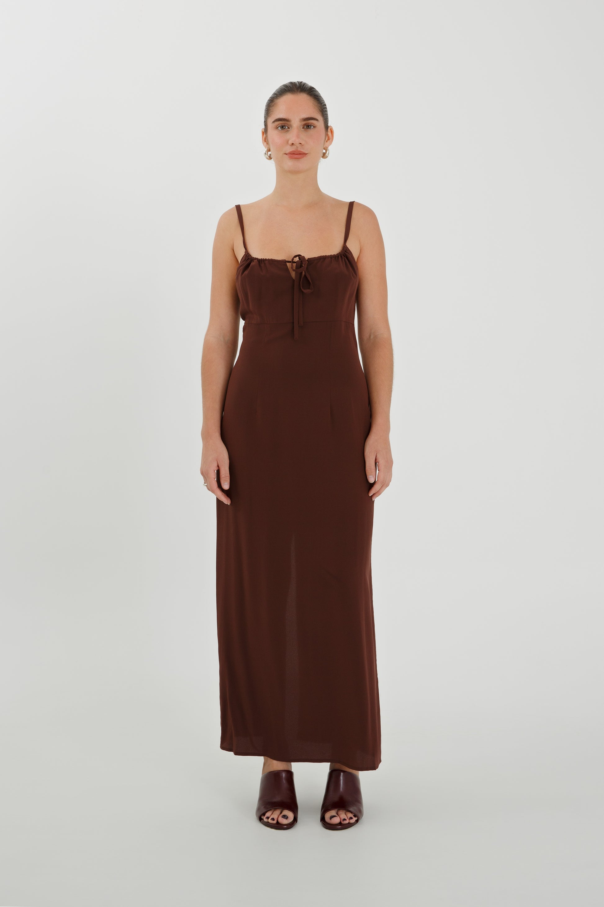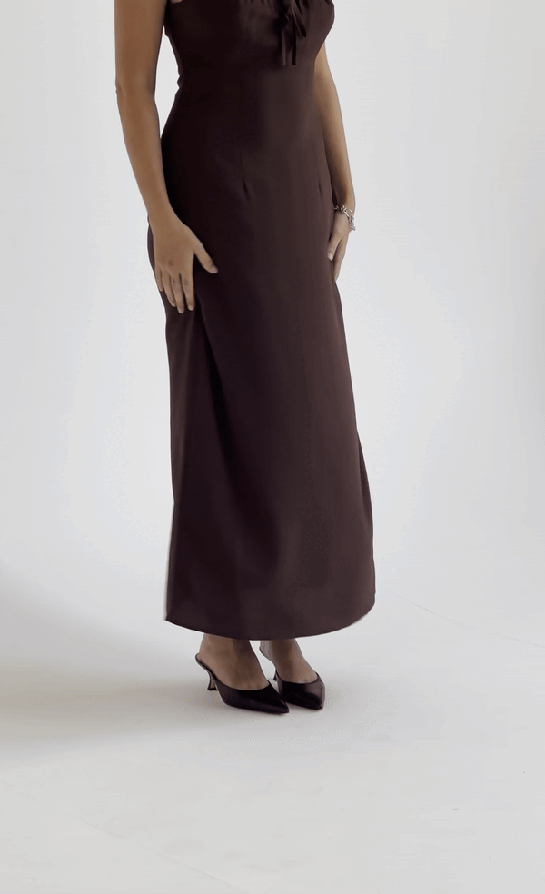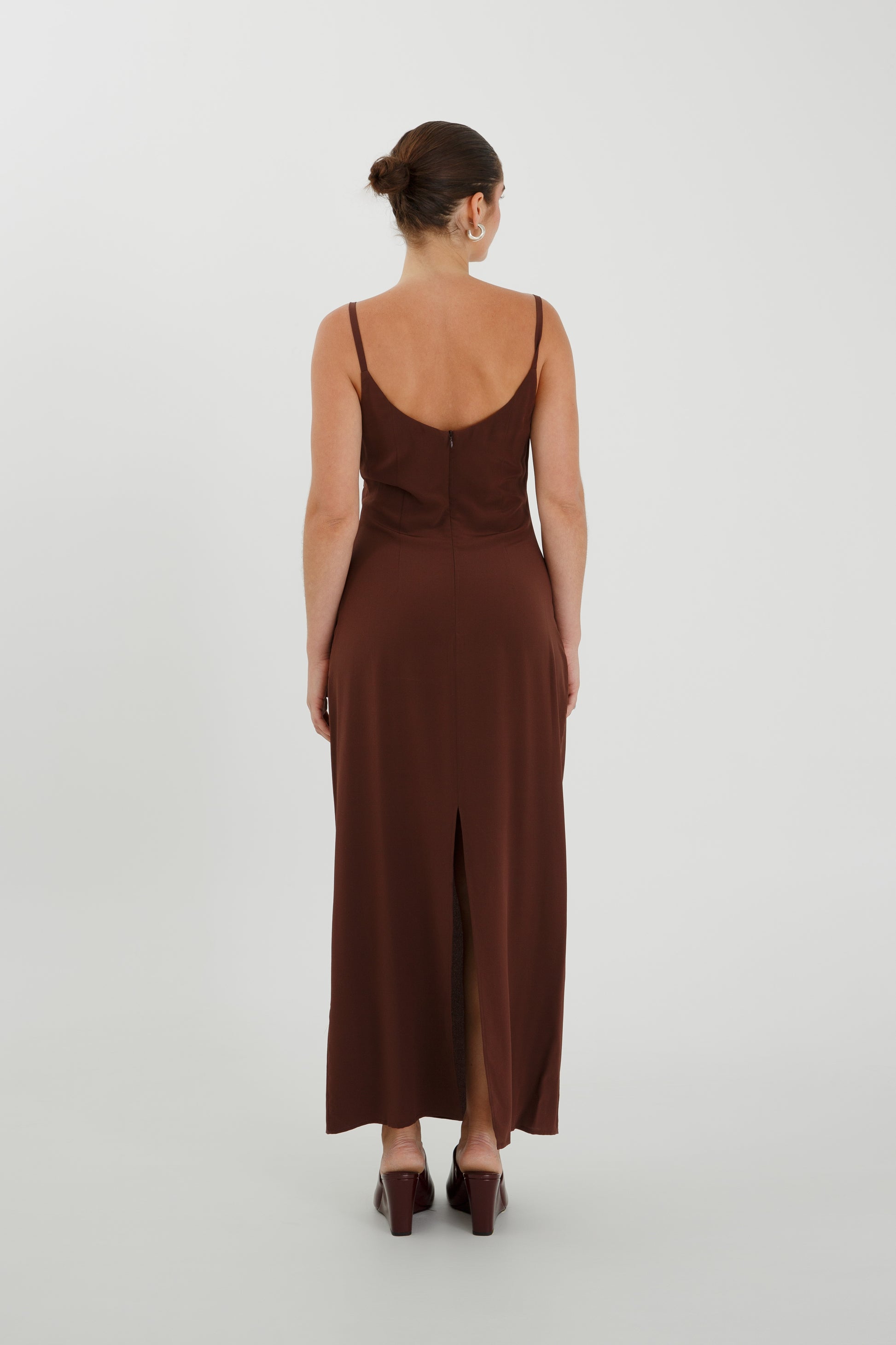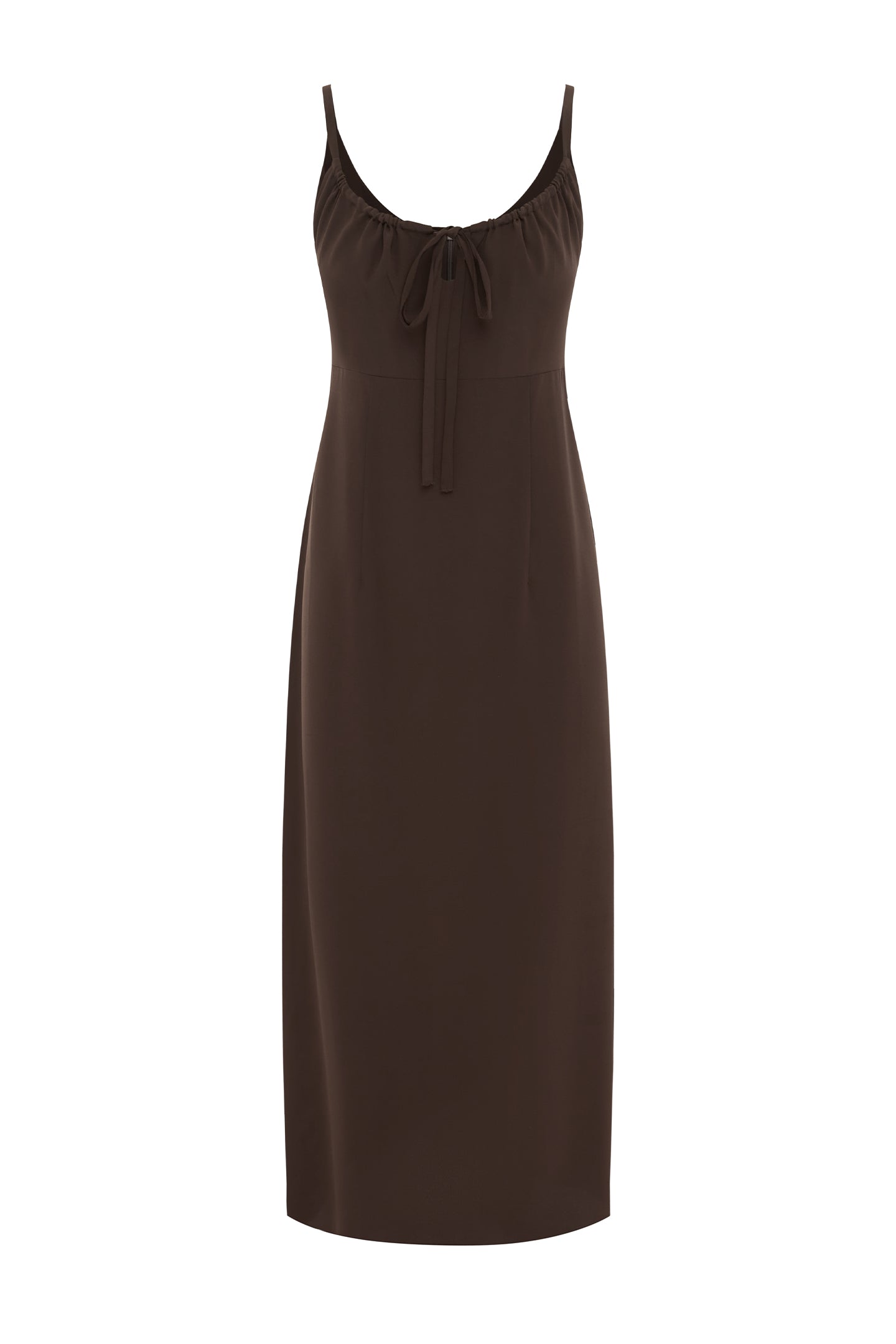 Empire silhouette dress in crepe de chine silk. Drawcord neckline, with centre front keyhole and adjustable straps. Ankle-length hemline, centre back invisible zip, and back hem slit.