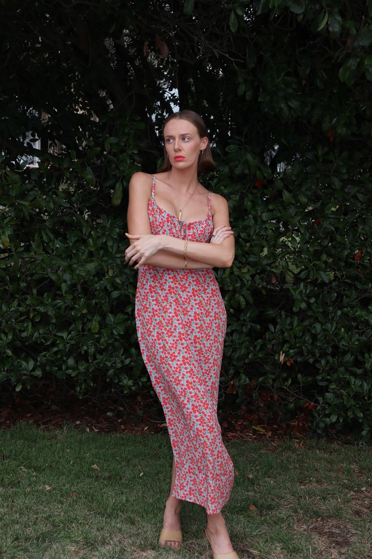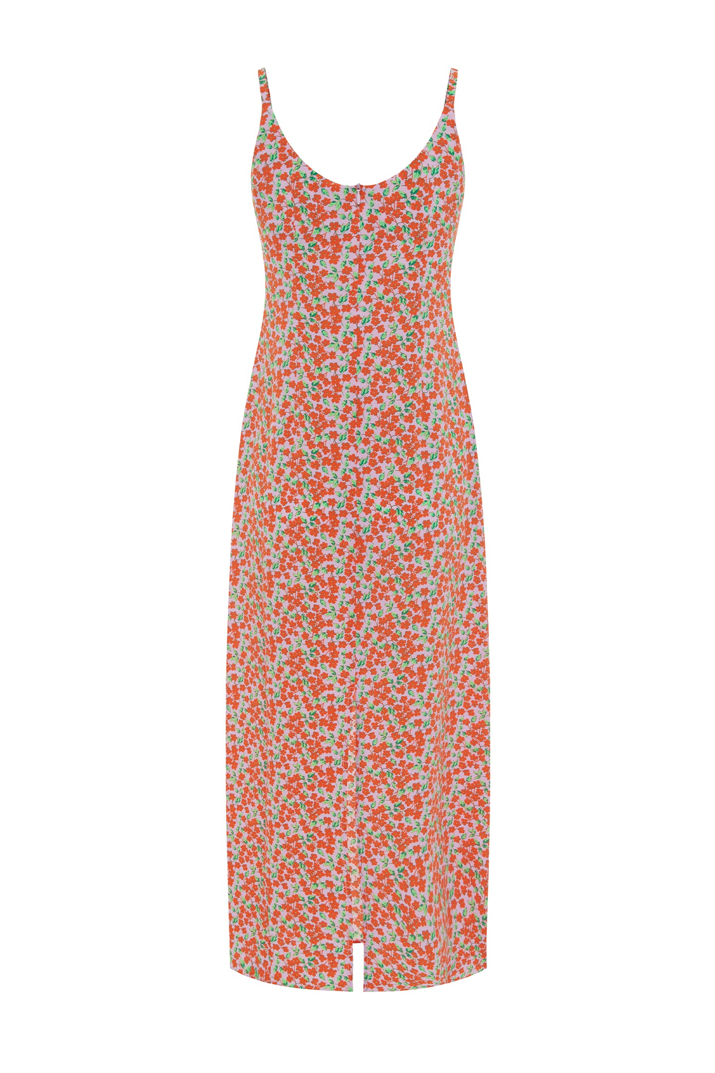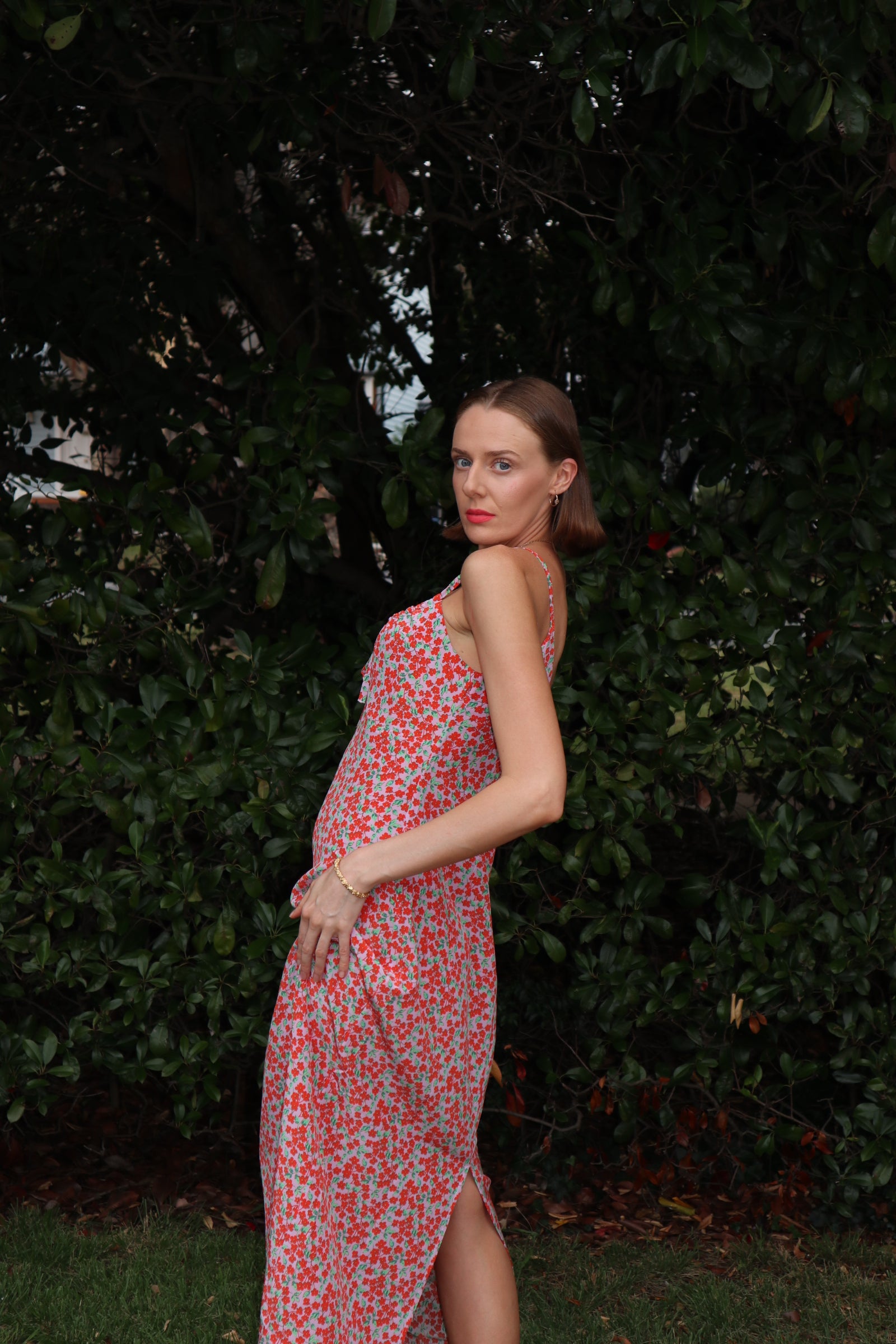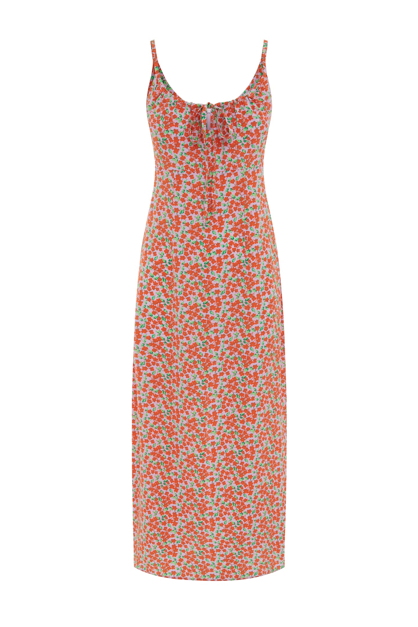 Empire silhouette dress in crepe de chine silk. Drawcord neckline, with centre front keyhole and adjustable straps. Ankle-length hemline, centre back invisible zip, and back hem slit.
