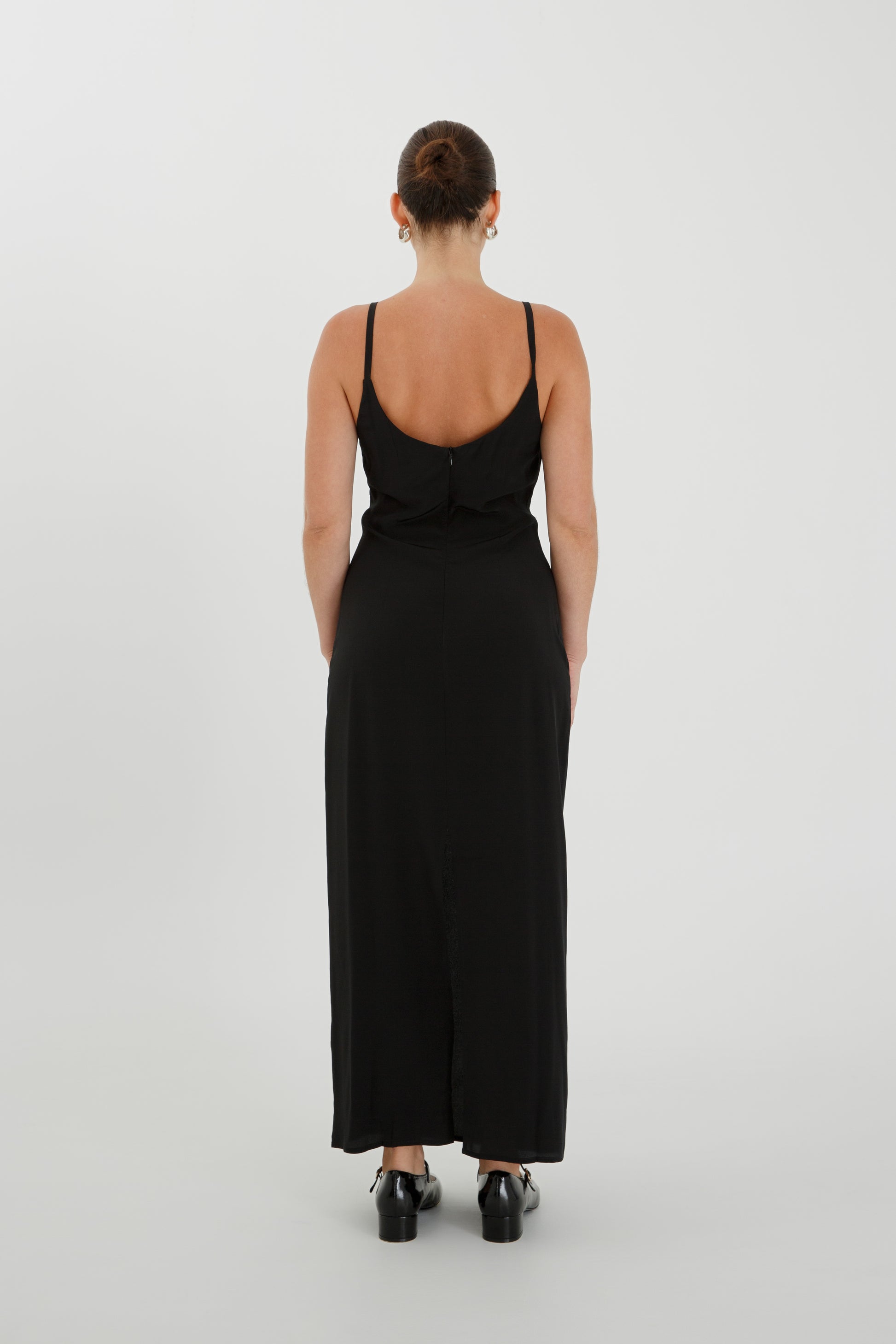 Empire silhouette dress in crepe de chine silk. Drawcord neckline, with centre front keyhole and adjustable straps. Ankle-length hemline, centre back invisible zip, and back hem slit.