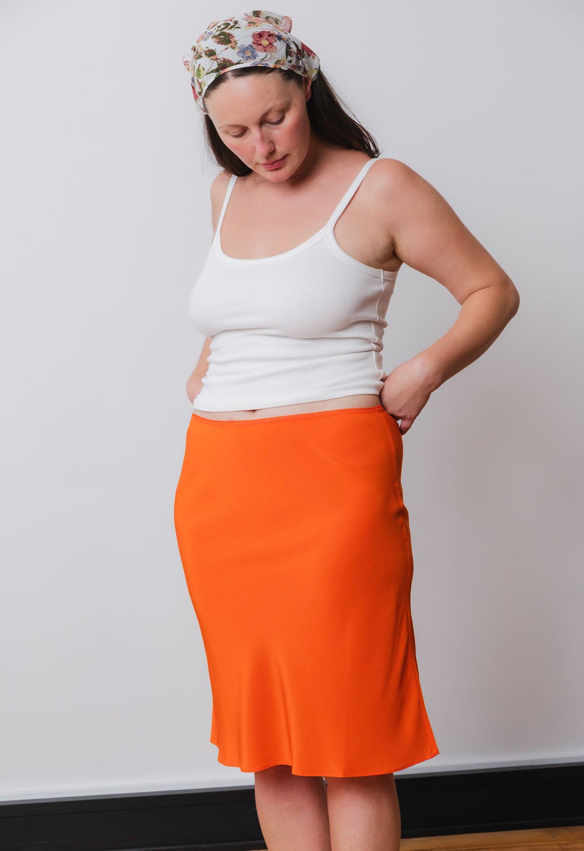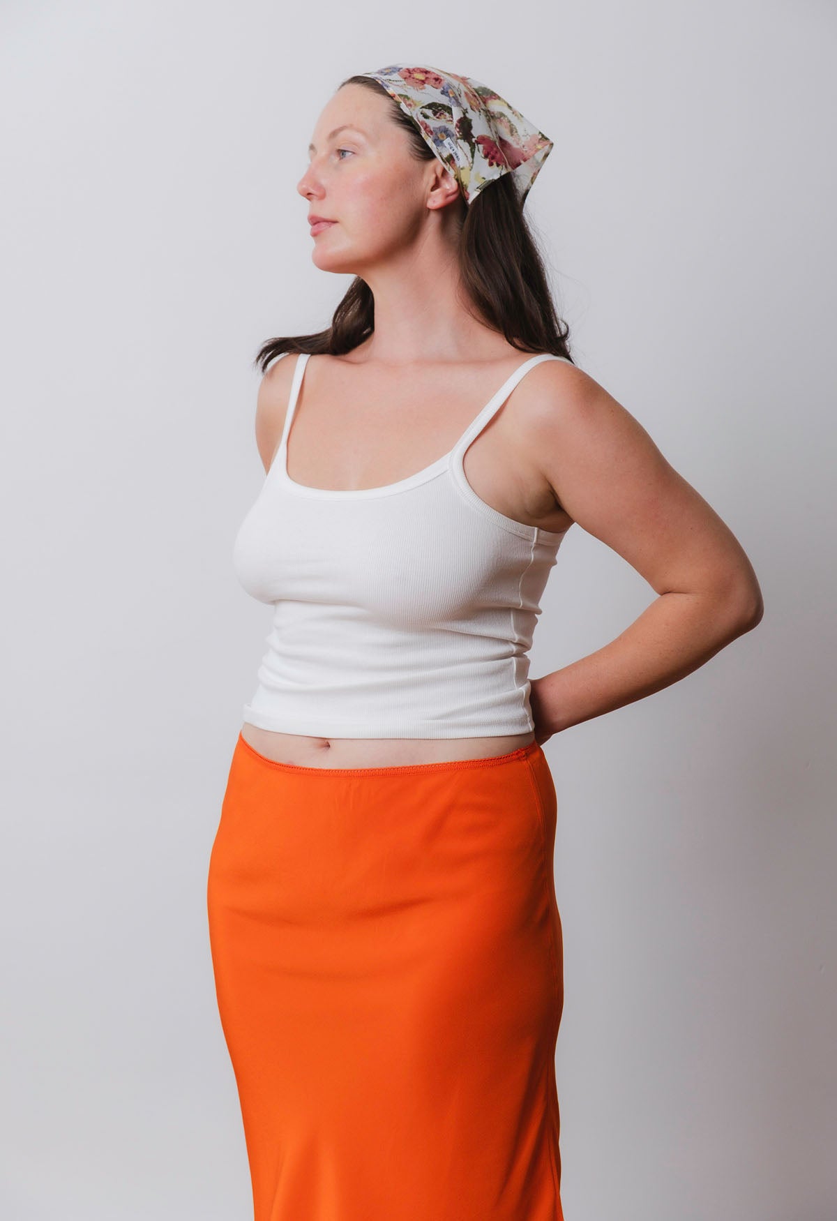 Triangular headscarf made from silk off-cuts from our apparel production. Designed with self-bind ties that can be secured under the chin or at the back of the head. Finished with a mini Olga Joan label.