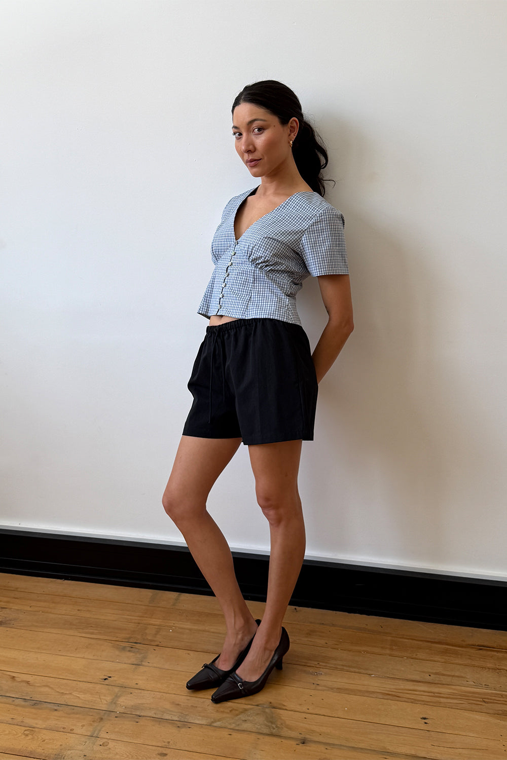 A relaxed short in 100% cotton with a mid-rise, elasticated drawcord waist and inseam pockets.