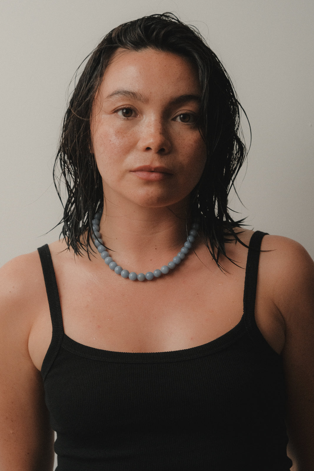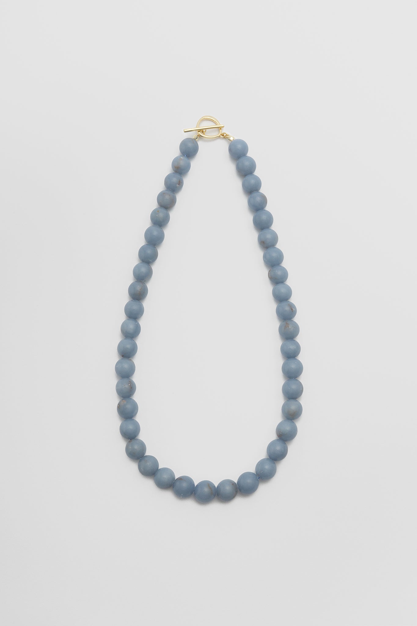 A collaboration between Olga Joan and Sun Ray. Angelite beads, natural and un-dyed, strung on silk. 14K gold-plated toggle closure. Lead and cadmium free, nickel safe.