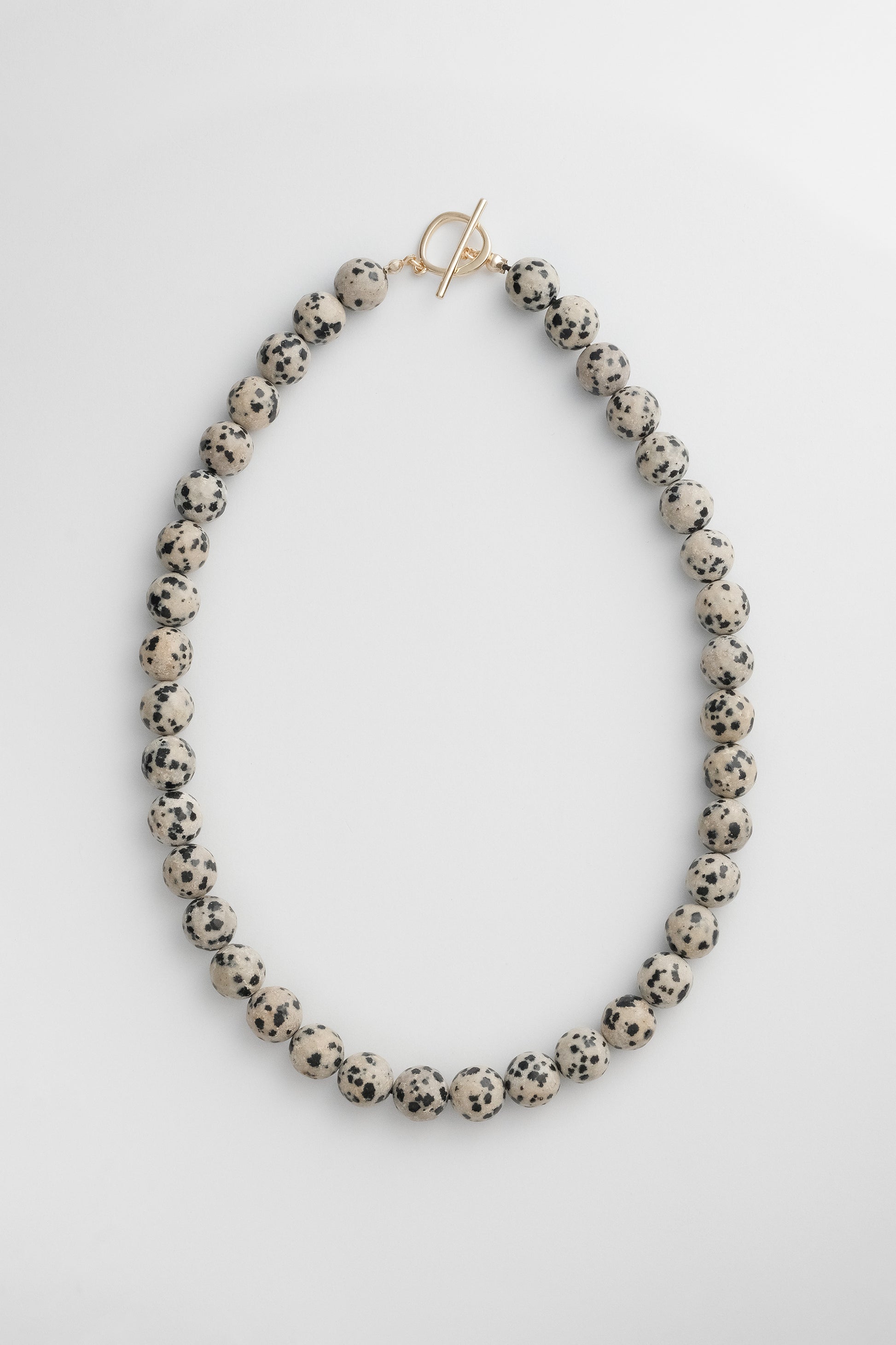 A collaboration between Olga Joan and Sun Ray. Dalmation Jasper beads, natural and un-dyed, strung on silk. 14K gold-plated toggle closure. Lead and cadmium free, nickel safe.