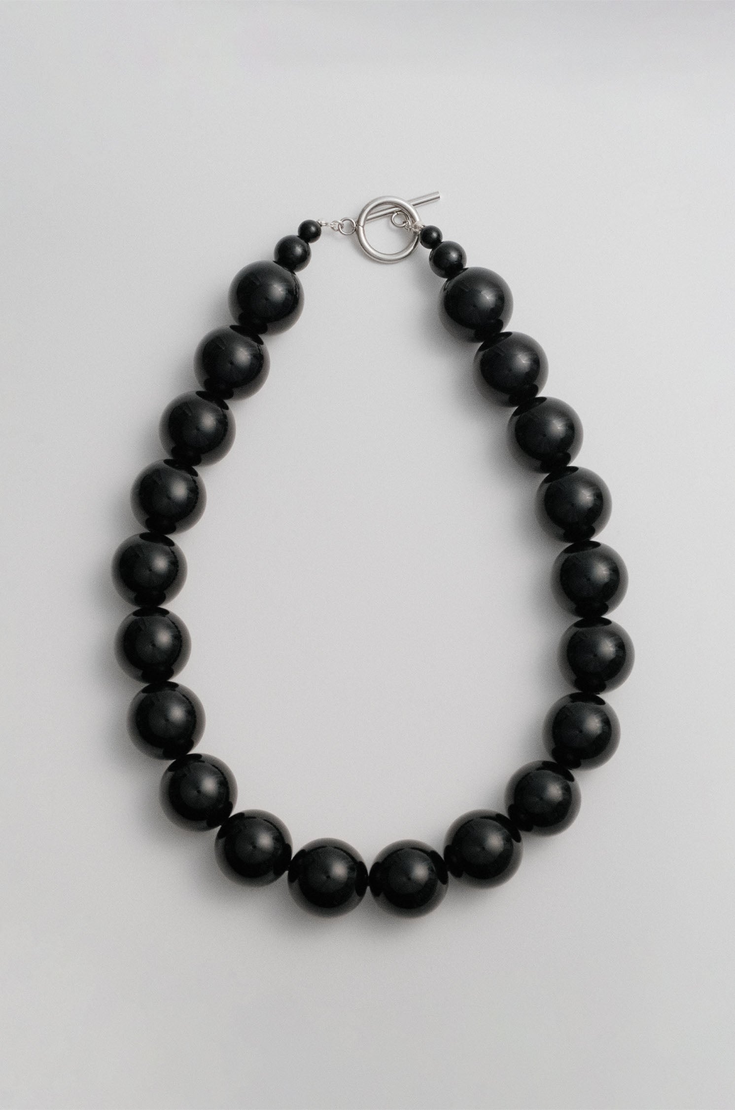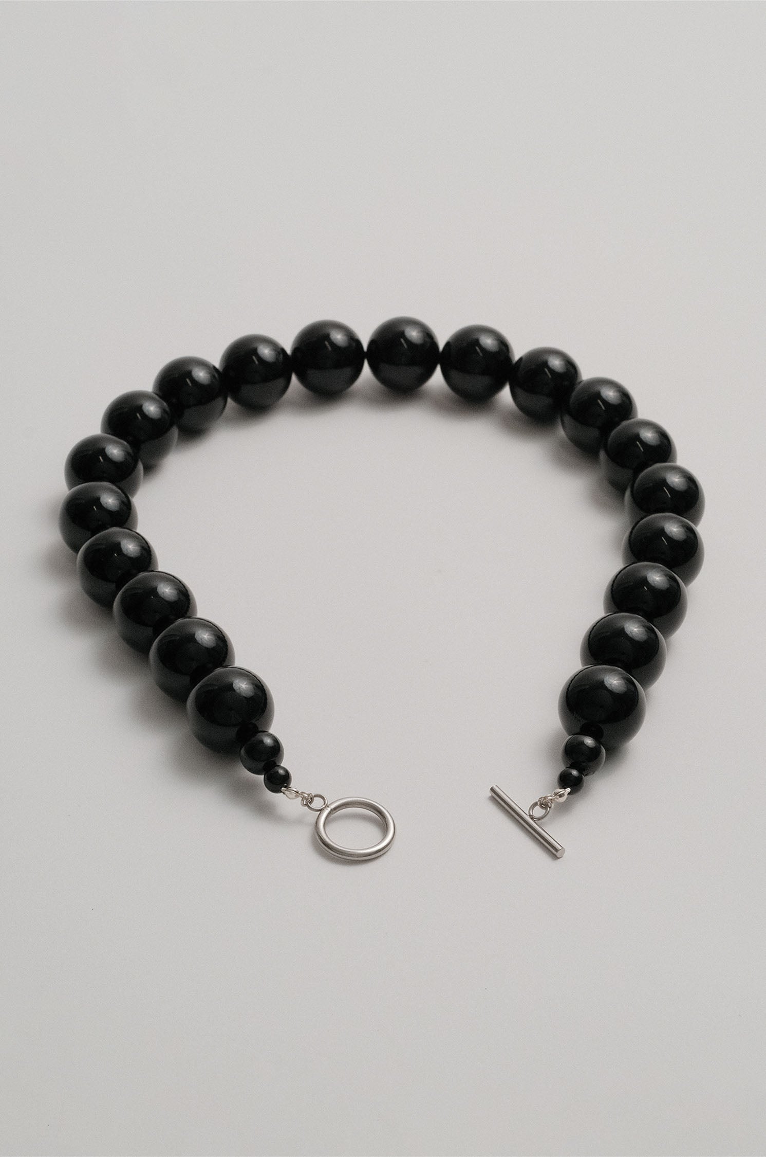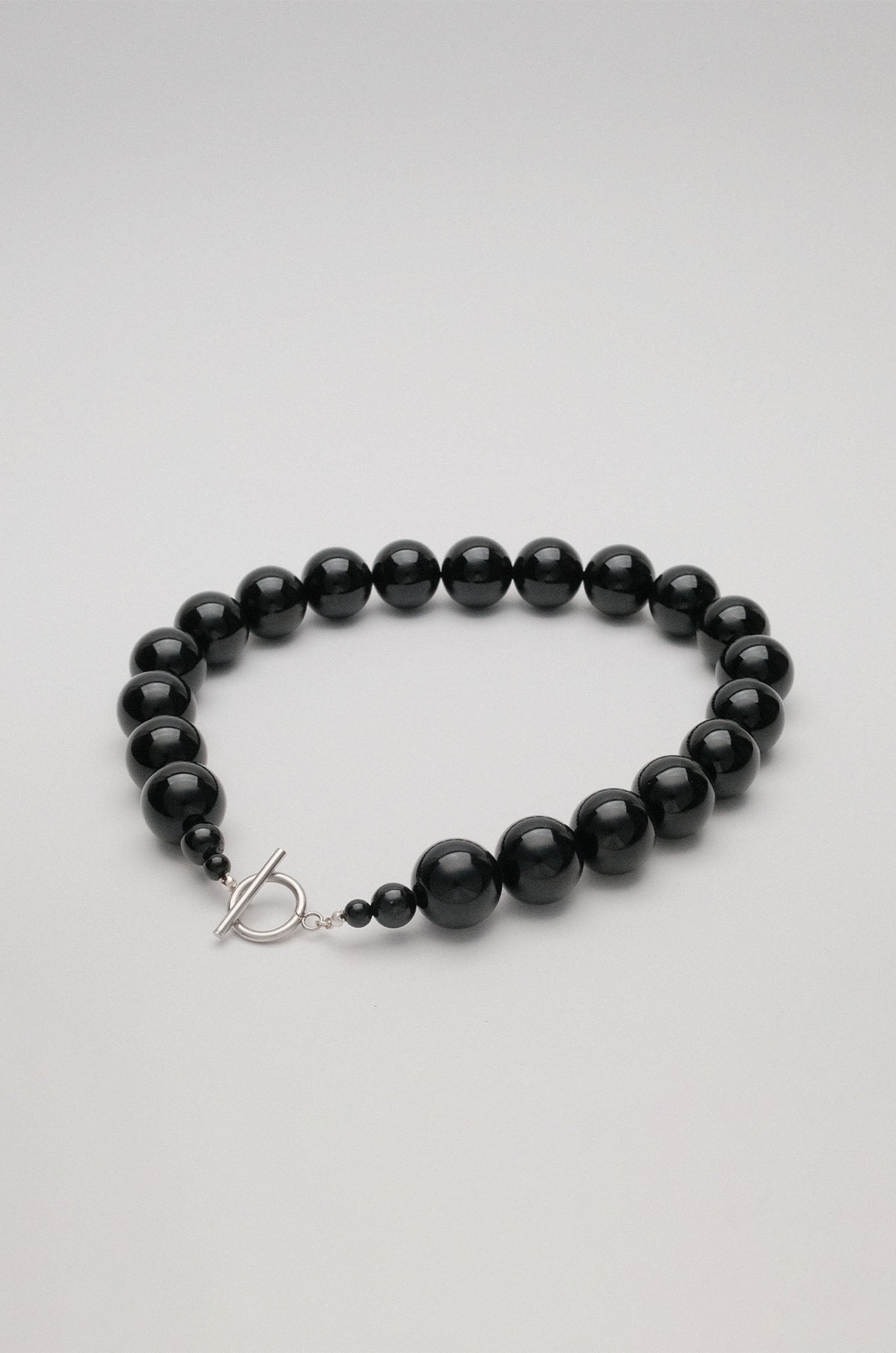 A collaboration between Olga Joan and Sun Ray. Onyx beads, natural and un-dyed, strung on silk. Tarnish resistant 304 stainless steel toggle closure.