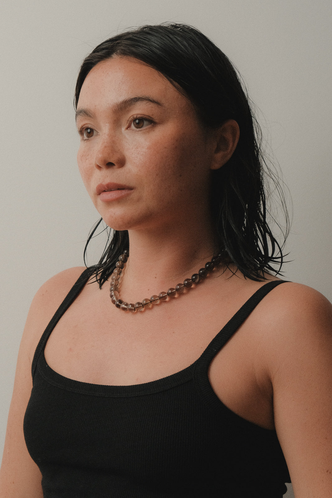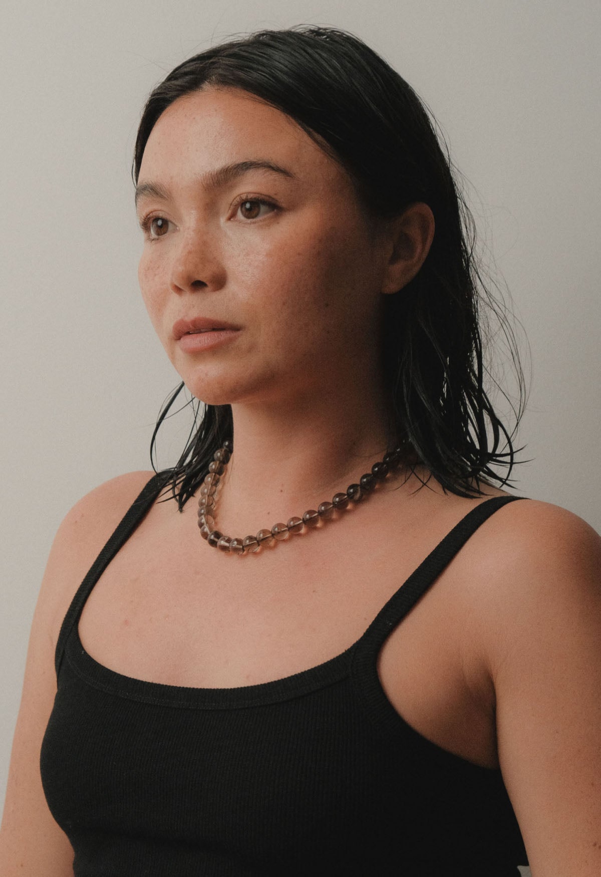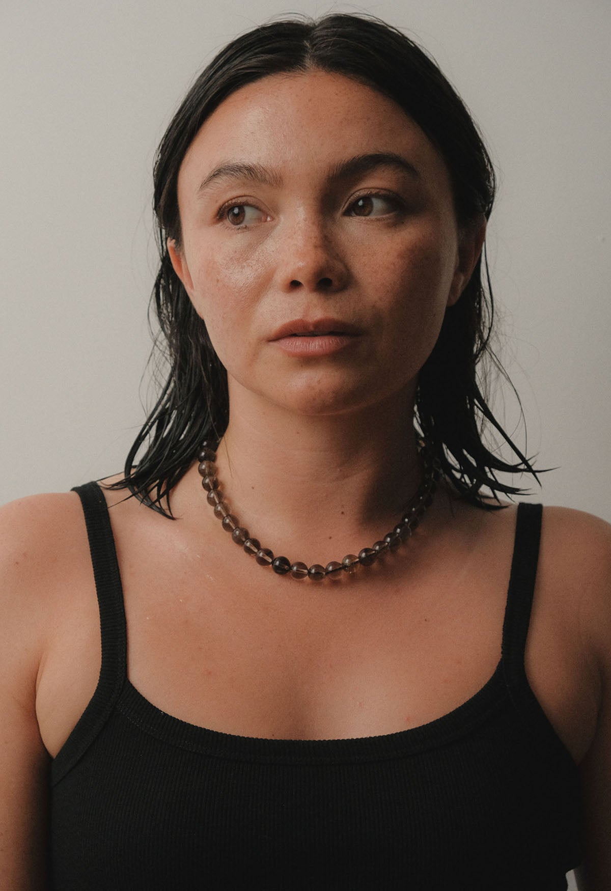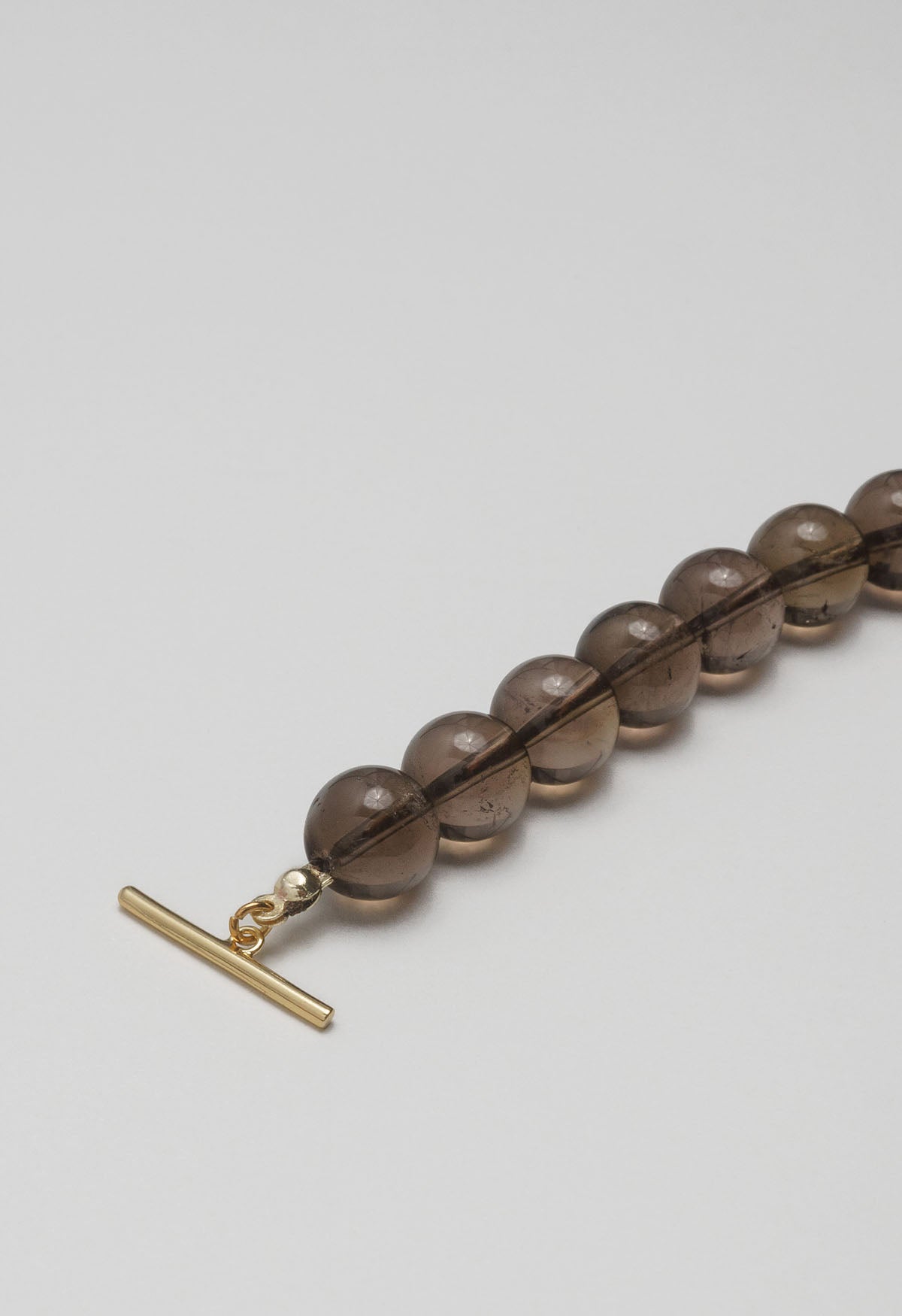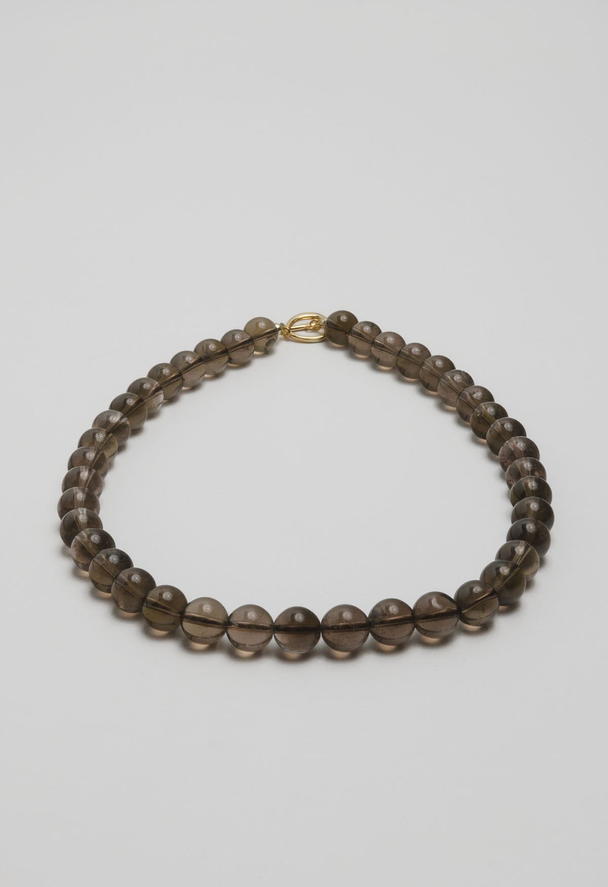 A collaboration between Olga Joan and Sun Ray. Smoky quartz beads, natural and un-dyed, strung on silk. 14K gold-plated toggle closure. Lead and cadmium free, nickel safe.