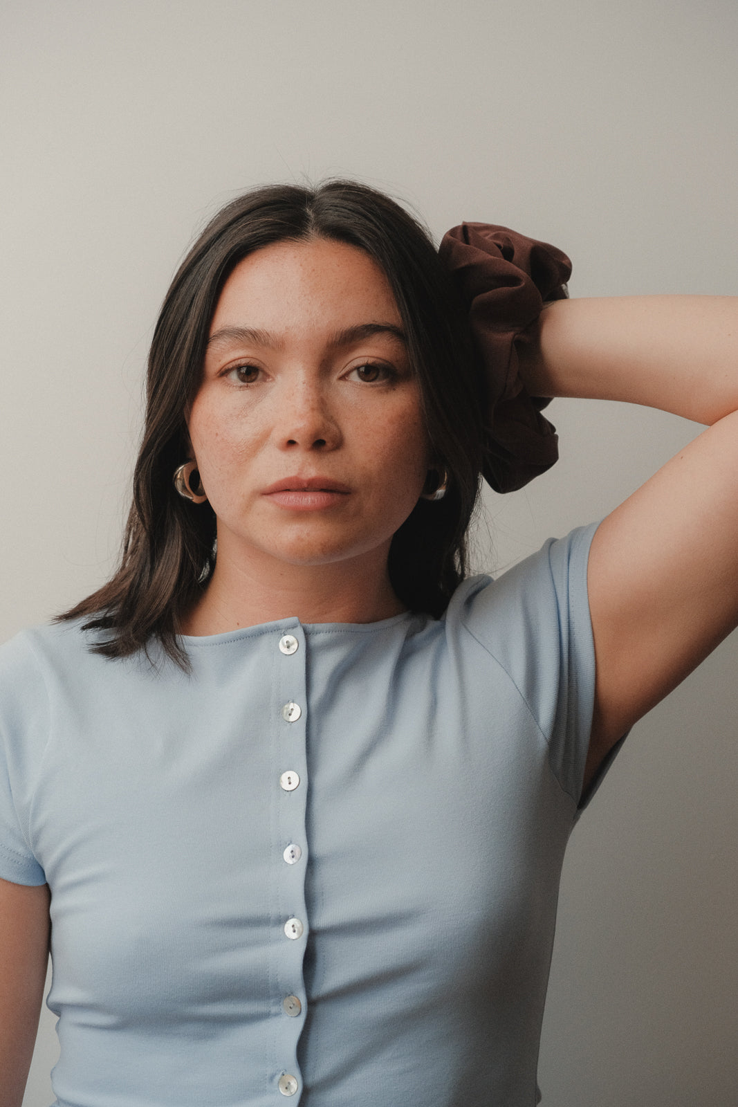 Oversized scrunchie crafted from silk off-cuts from our apparel production. Finished with a mini Olga Joan label. The smooth silk finish is gentle on hair, helping to reduce breakage and creasing.