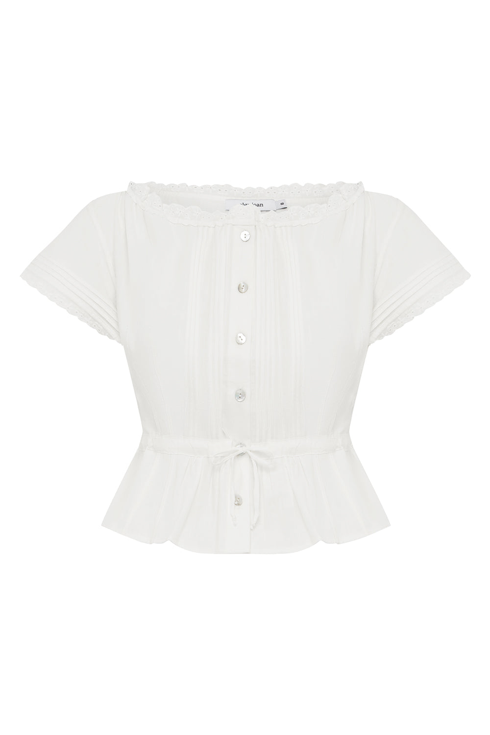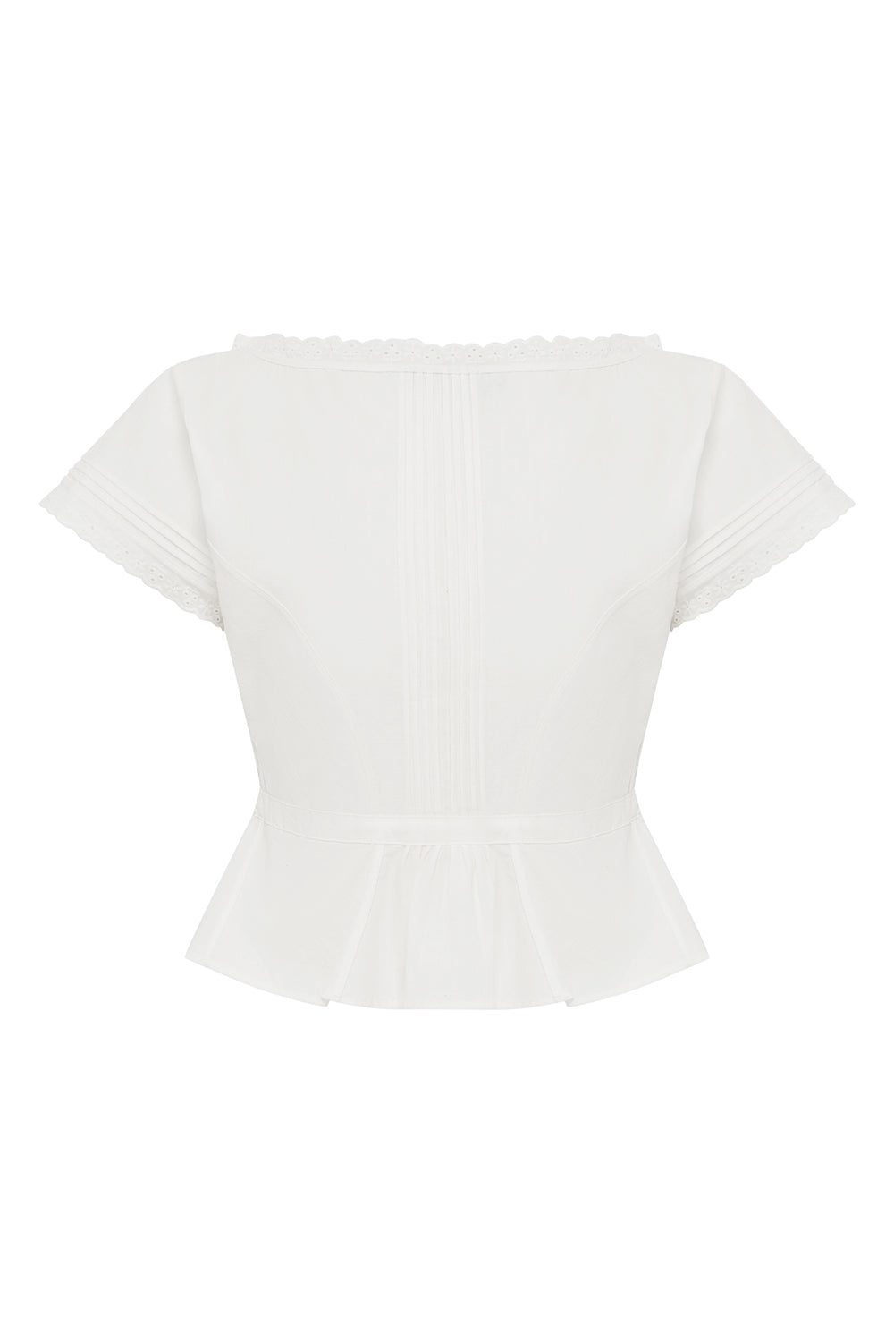 Blouse with pintuck detailing throughout. Features a drawcord neckline and waist, mother of pearl buttons, and cotton scallop-edge lace at the neckline and sleeve hems. Finished with bodice darts, back princess seams, and a soft fluted hem.