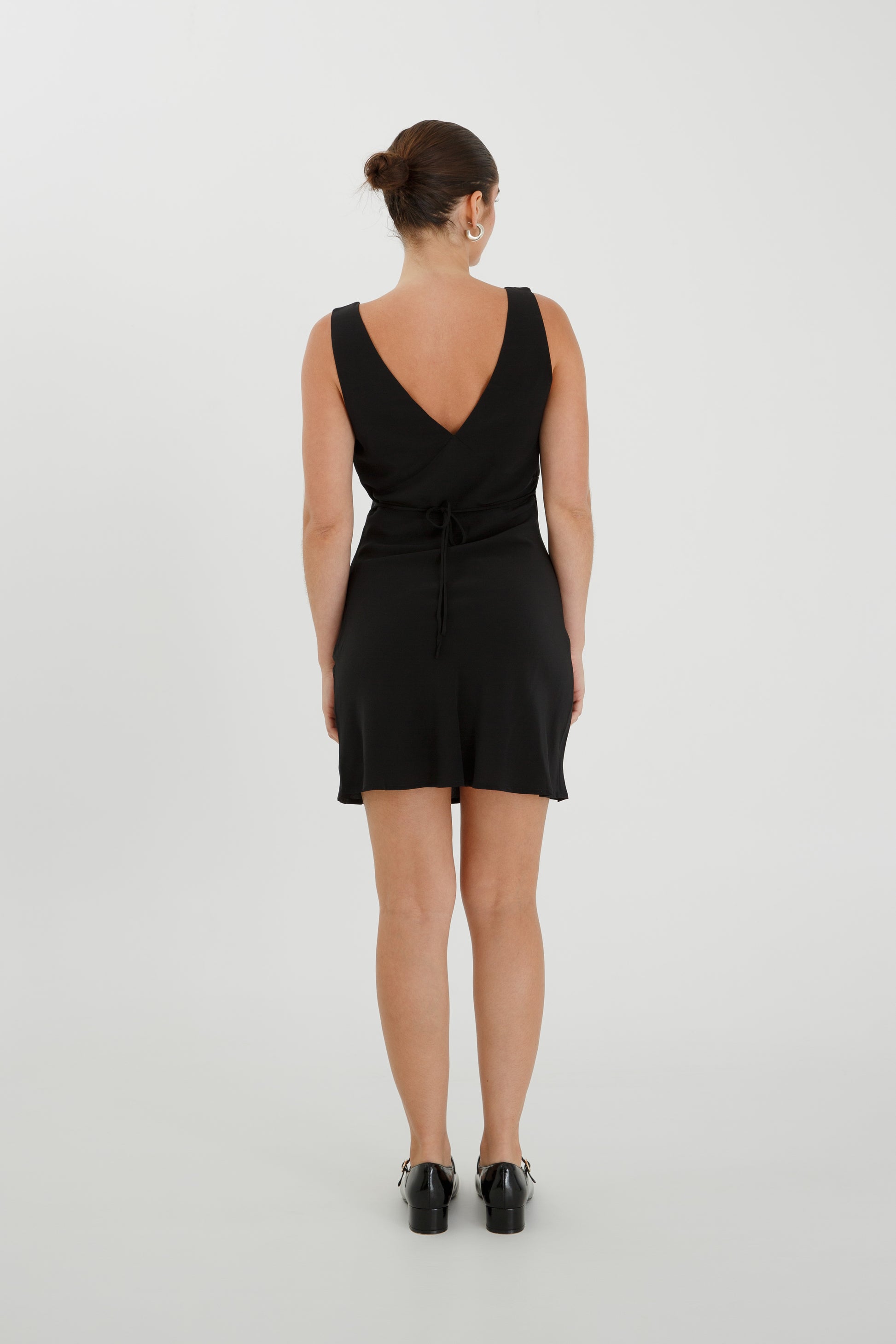 Bias-cut mini dress in crepe de chine silk. Features a self-lined bodice, side seam zipper, and adjustable back waist tie.