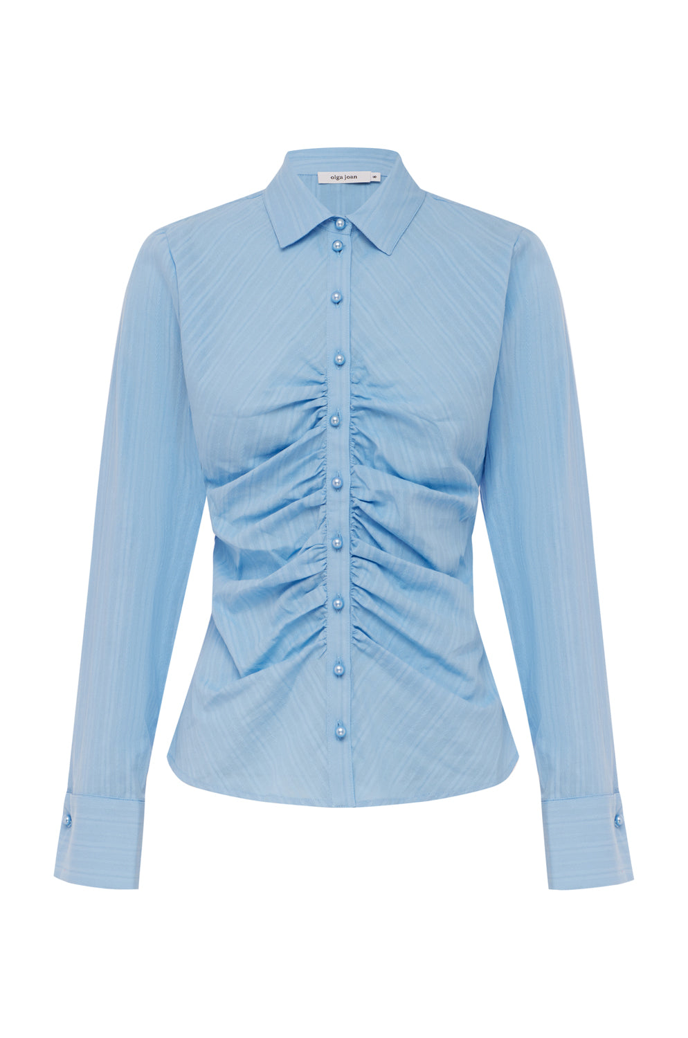Tailored cotton jacquard shirt with a ruched front detail and classic collar. Features sphere shank buttons, French square cuffs, and back waist darts for a refined silhouette. Finished with a structured yet breathable feel.