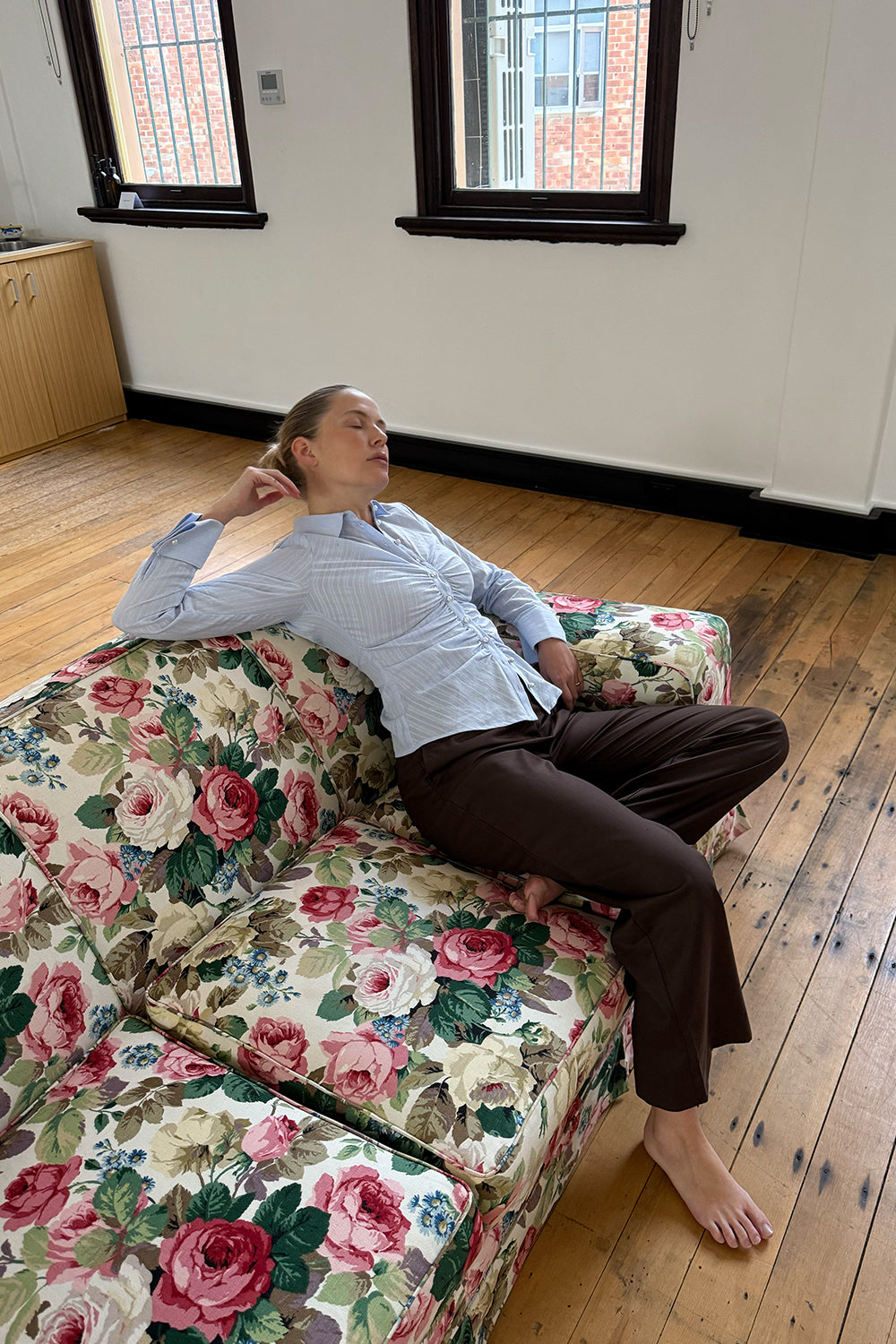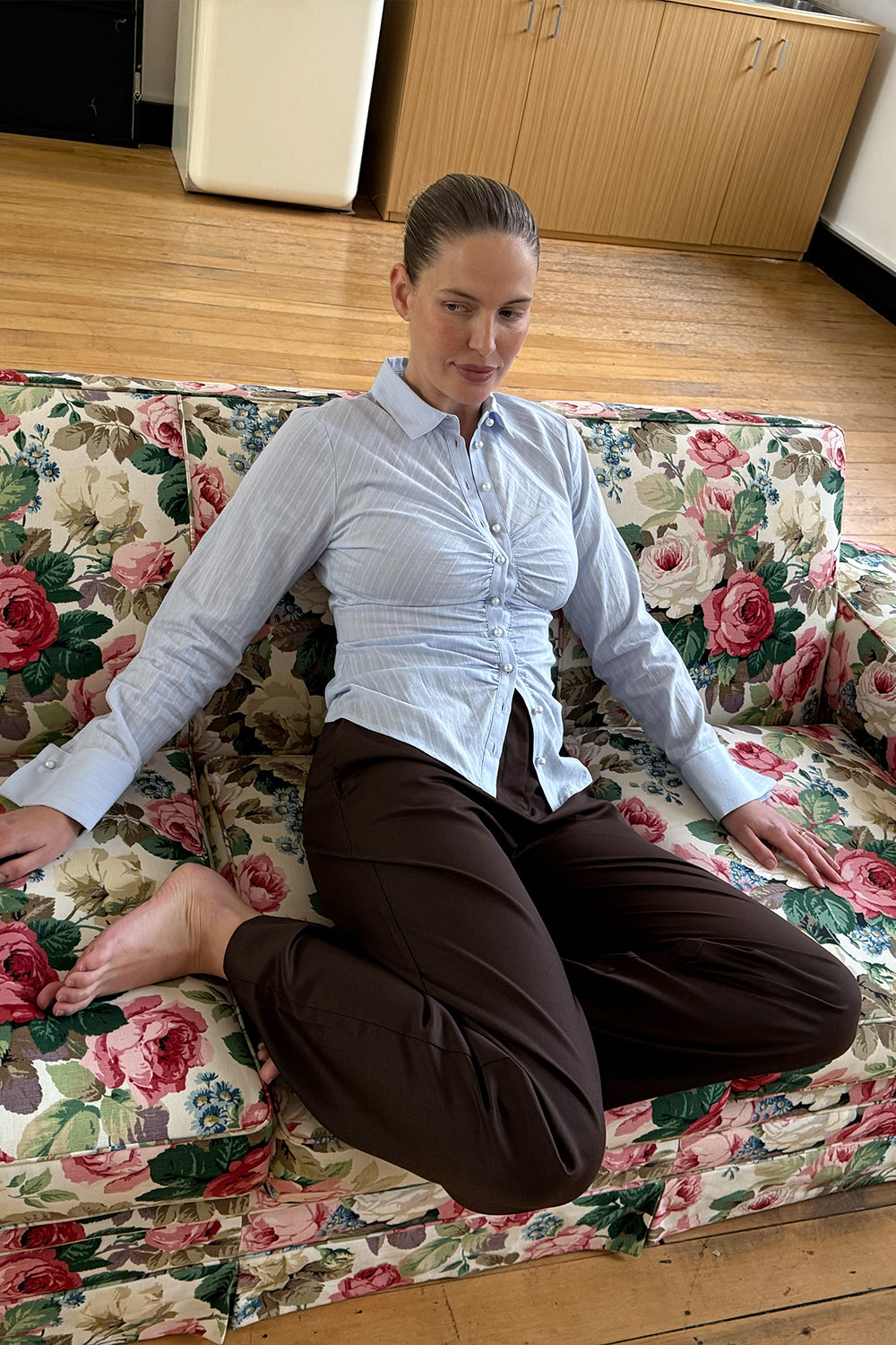 Tailored cotton jacquard shirt with a ruched front detail and classic collar. Features sphere shank buttons, French square cuffs, and back waist darts for a refined silhouette. Finished with a structured yet breathable feel.