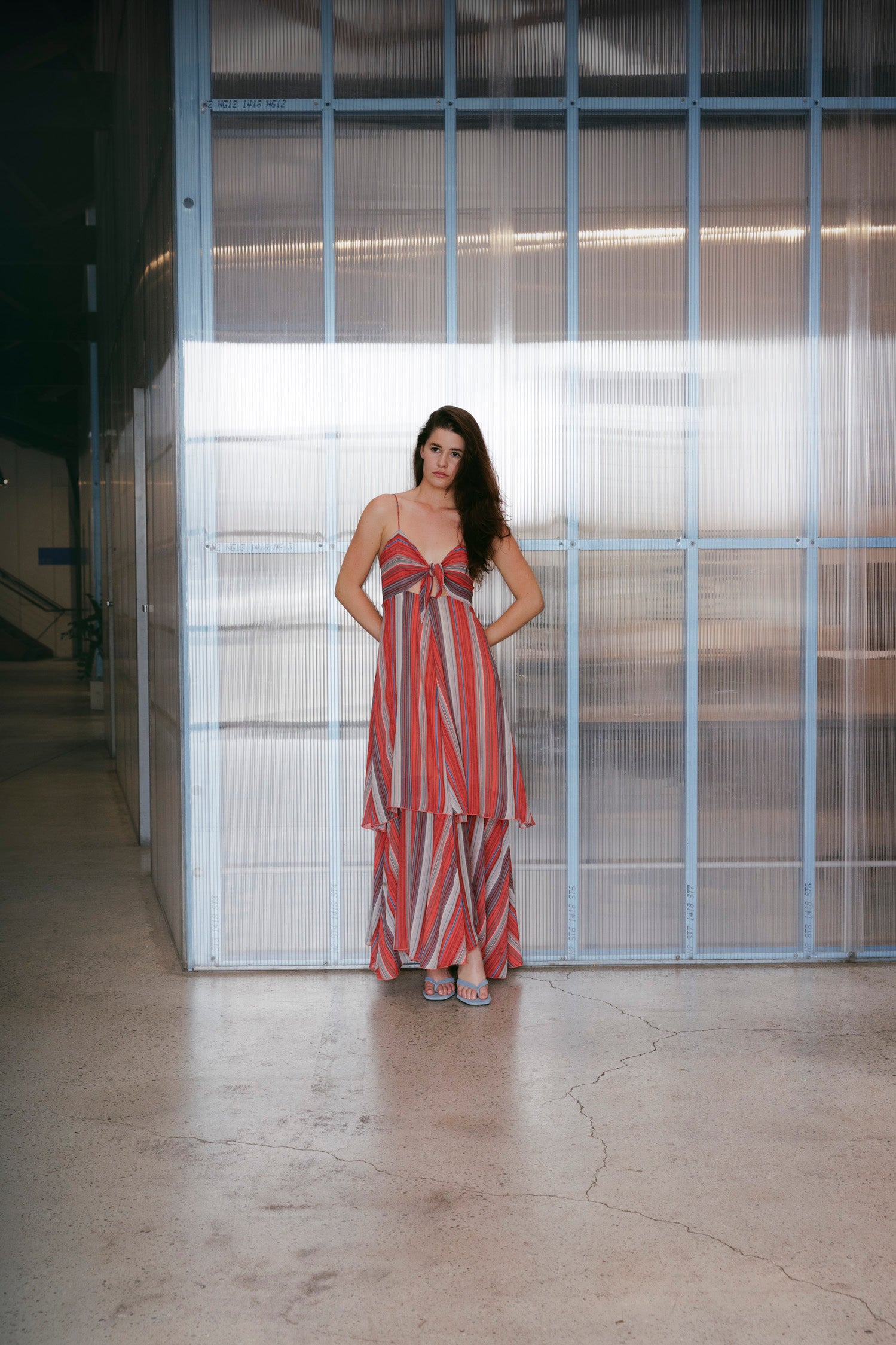 Tiered silk georgette dress with an adjustable front tie and halter neckline. Designed with multiple styling options through fine rouleau ties, a softly draped two-tier skirt, and a concealed centre-back zip. Fully lined in Tencel for a fluid finish.
